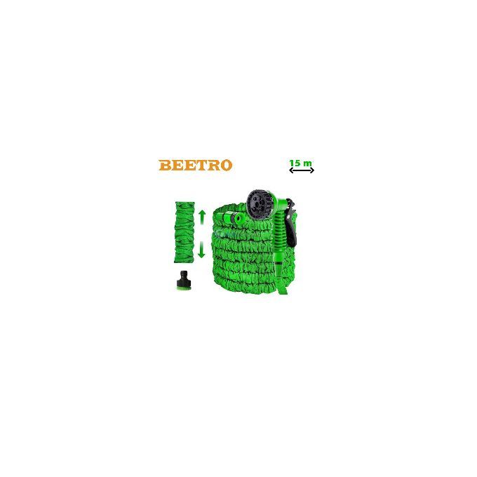 Tuyau d'arrosage d'une longueur de 7,5M qui peut être prolongé jusqu'à 22,5M Après avoir connecté le tuyau d'eau à l'eau, le tuyau de pression d'eau se dilatera rapidement jusqu'à trois fois sa longueur et reviendra à sa longueur d'origine quelques minutes après la vidange. Assurez-vous simplement que la pression de l'eau est suffisante pour étirer le tuyau. Compatible avec les robinets de jardin.