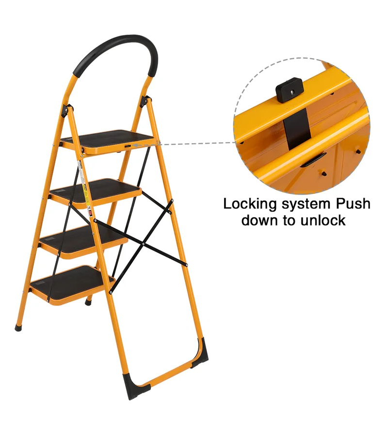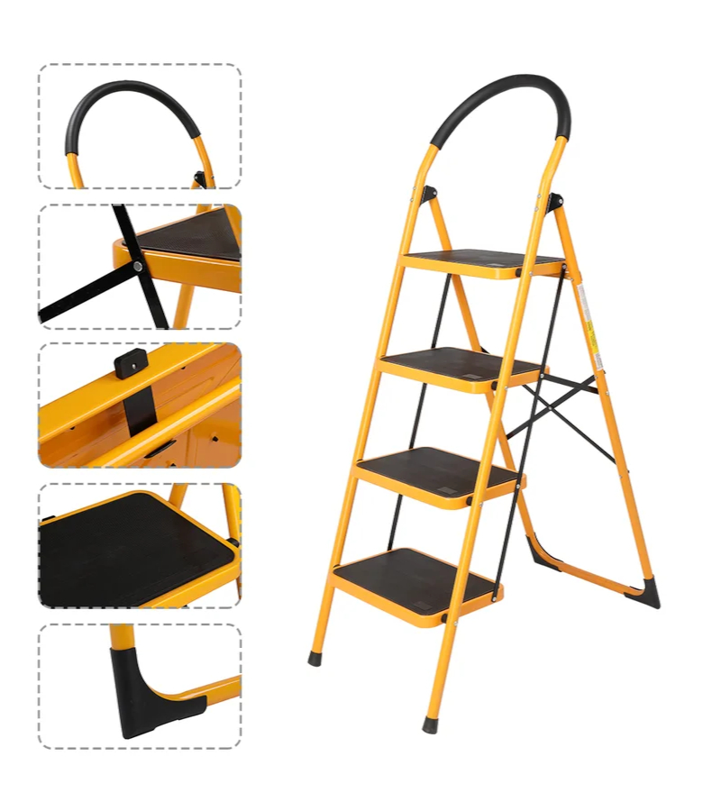 Escabeau pliant avec armature en acier. Larges marches en métal munies d'un motif antidérapant et de stabilisateur pour plus de sûreté. Patins antidérapants. Poignée recouverte de mousse de polyuréthane. Facile à transporter et peu encombrant une fois plié. Charge maximale (150 kg). • 4 marches • Poignée enveloppée pour l’équilibre • Marche large et antidérapante • Pied antidérapant et résistant à l’usure • Taille de la marche: 38x26cm • Taille ouverte: 83x49x129cm • Charge maximale: 150 kg